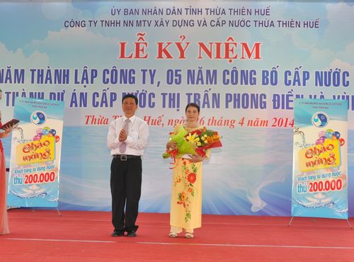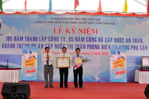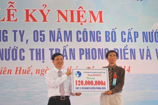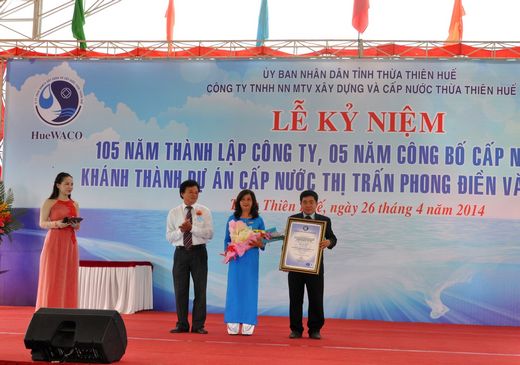 Cũng nhân dịp này, Công ty đã vinh dự đón nhận chứng chỉ ISO 14.001 về môi trường và Bằng khen Thủ tướng Chính phủ cùng nhiều Bằng khen của Bộ Xây dựng, của Hội Cấp thoát nước Việt Nam, của Liên Hiệp Hội Khoa học Kỹ thuật Việt Nam trao tặng cho các cá nhân và tập thể Công ty. Bên cạnh đó, Công ty đã trao số tiền 120 triệu đồng hỗ trợ thoát nghèo cho 12 hộ nghèo trên địa bàn 4 xã Phong Thu, Phong Sơn, Phong Xuân, Phong Mỹ và trao quà cho khách hàng may mắn thứ 200.000 sử dụng nước sạch của Công ty, đánh dấu một cột mốc quan trọng trong việc phát triển của HueWACO.