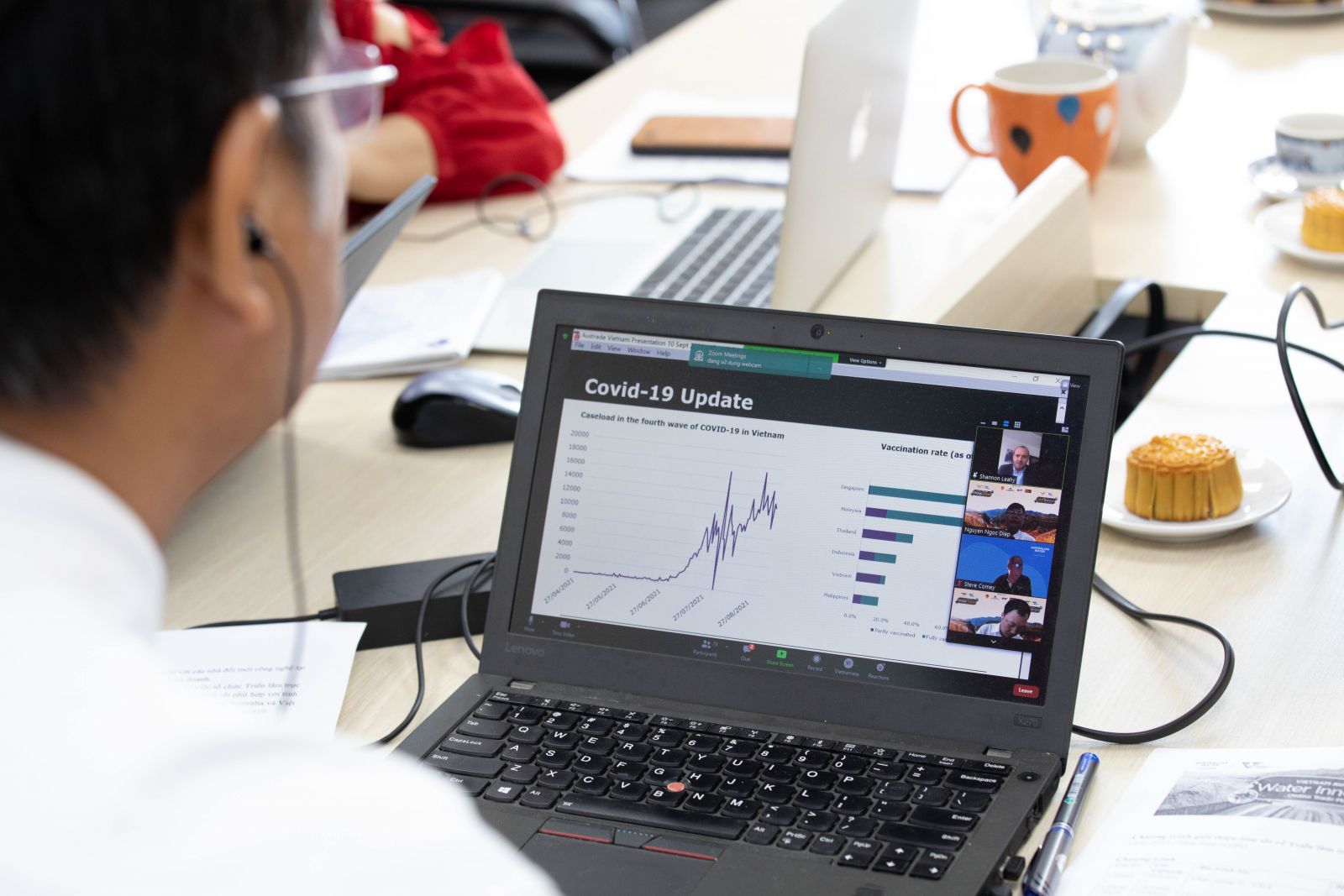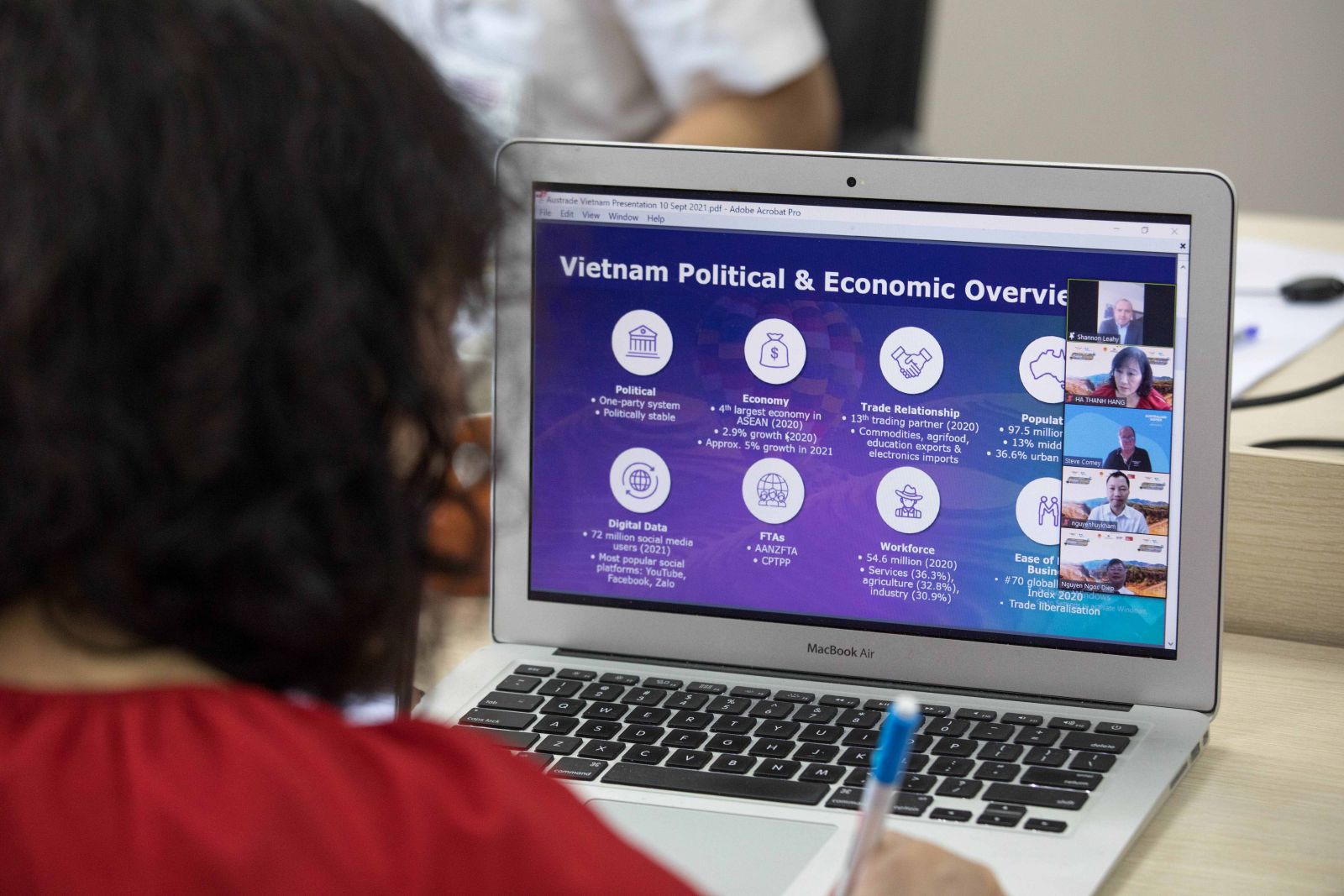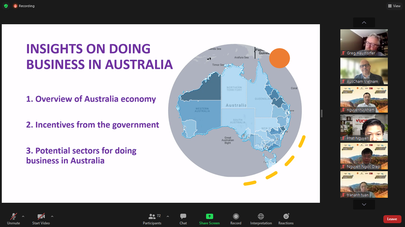 Tiếp nối buổi họp, các đại biểu tiếp tục nghe đại diện Hội Nước Úc và Thương vụ Việt Nam tại Úc phát biểu về các vấn đề xoay quanh sự kiện, khái quát về bối cảnh hiện nay khi đại dịch COVID-19 vẫn đang diễn biến phức tạp, tình hình kinh tế hai nước cũng như tình hình, triển vọng hợp tác Việt - Úc.