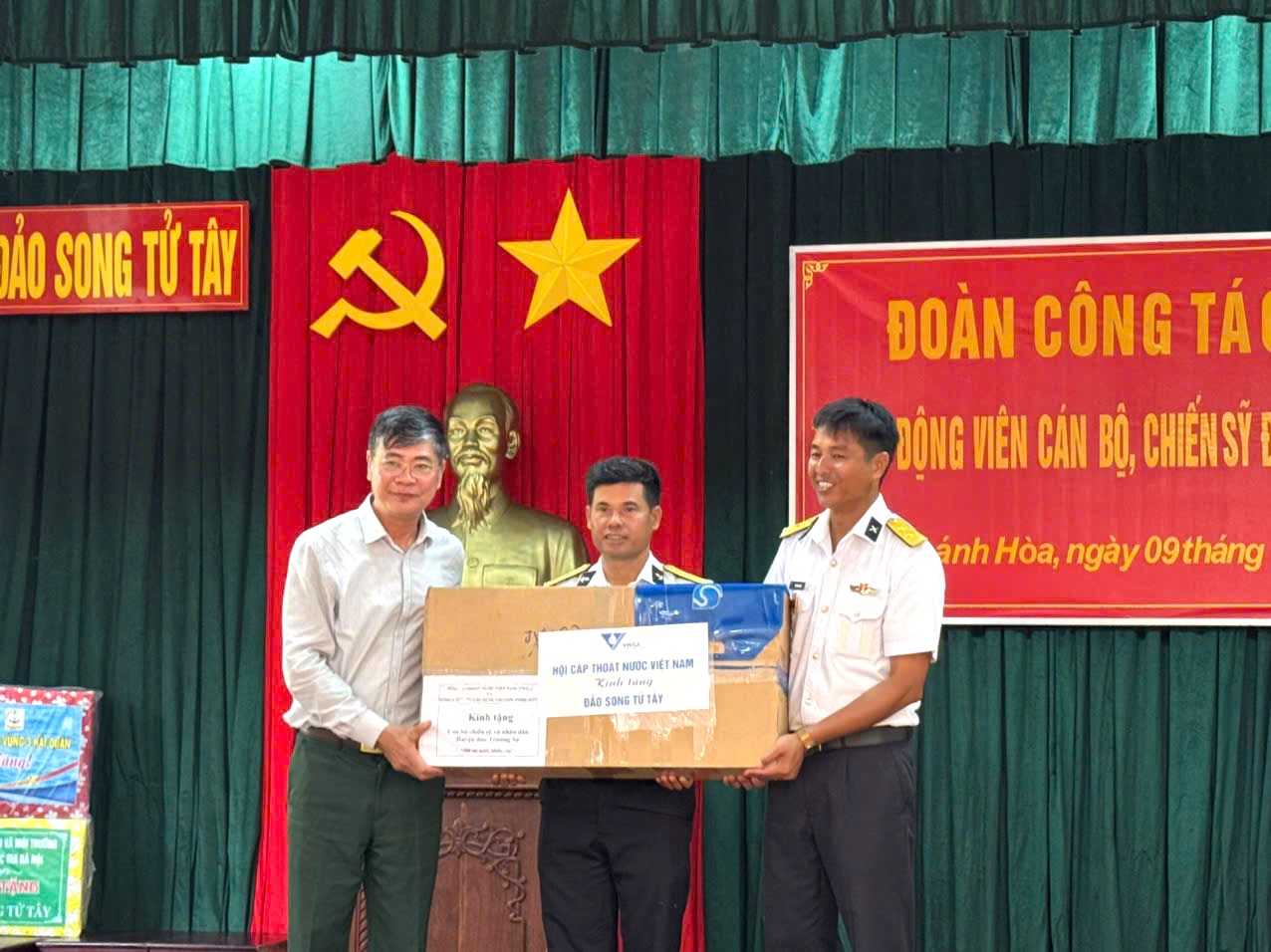 Thay mặt VWSA, Chủ tịch Nguyễn Ngọc Điệp đã tặng quà cho các cán bộ, chiến sĩ tại các đảo mà đoàn ghé thăm gồm 500 túi nước loại 5 lít do Tổng Công ty Cấp nước Sài Gòn (SAWACO) đóng góp.