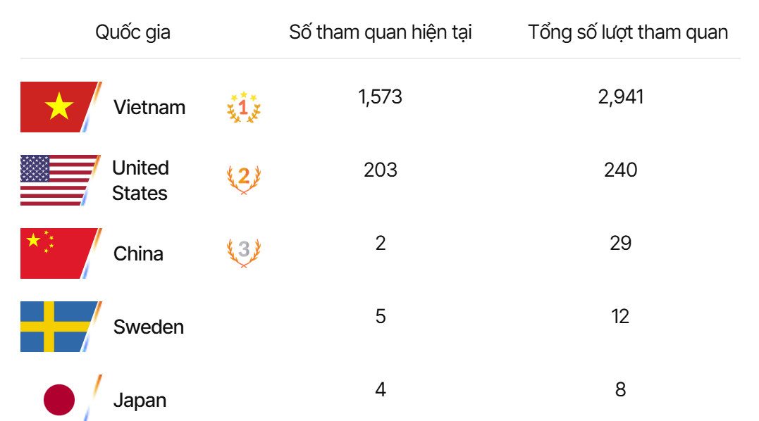 Việt Nam, Hoa Kỳ và Trung Quốc lần lượt là ba quốc gia có số lượt khách tham quan trực tuyến cao nhất.
